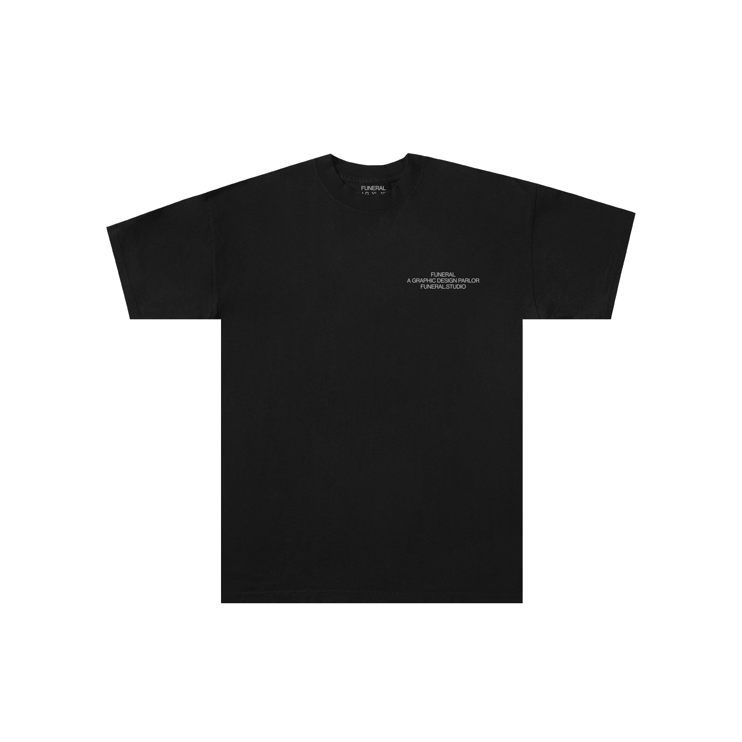The classic studio shop tee. White screenprint on black crewneck shirt feat. custom printed tag, left chest advertisement block, and “Work in Peace” on the back.